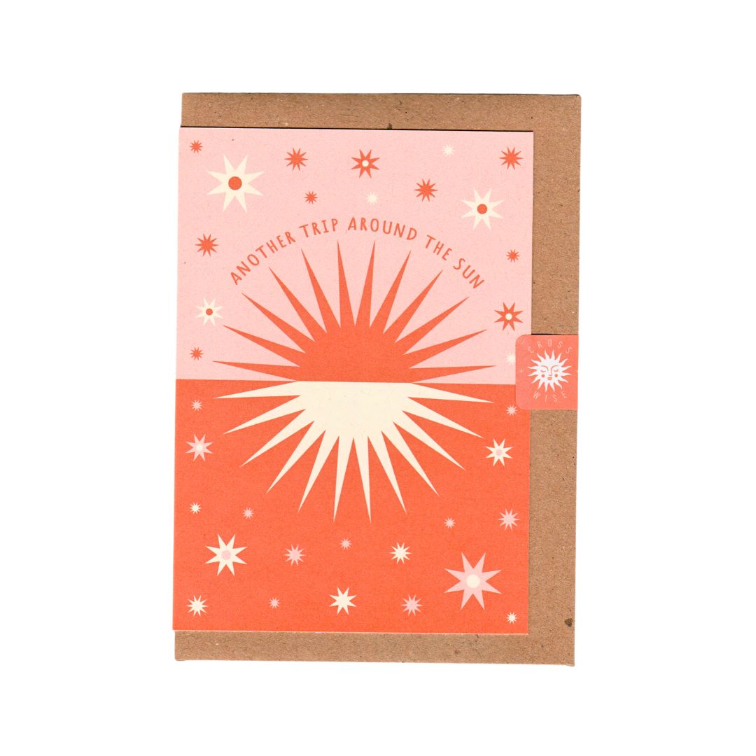A bright, bold birthday card celebrating another trip around the sun. Featuring a two-tone sun, pink-and-red colour pop and a sprinkling of stars, it’s the perfect card for anyone who deserves a cheerful, cosmic high-five on their big day. Great for people who love birthdays… or people who’d rather pretend it’s “just another Tuesday.”