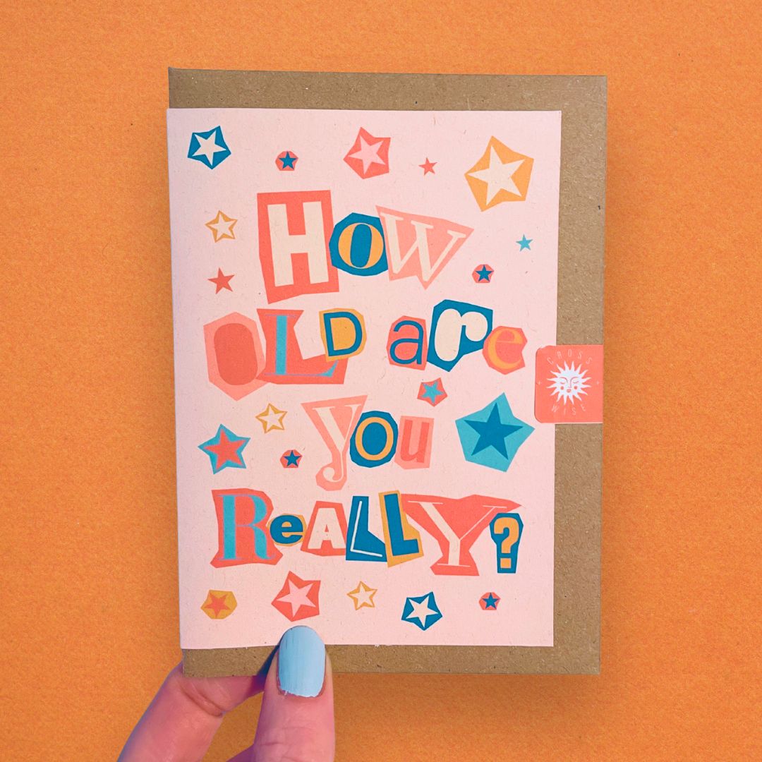 A cheeky birthday card in ransom-style lettering asking the real question: how old are you?