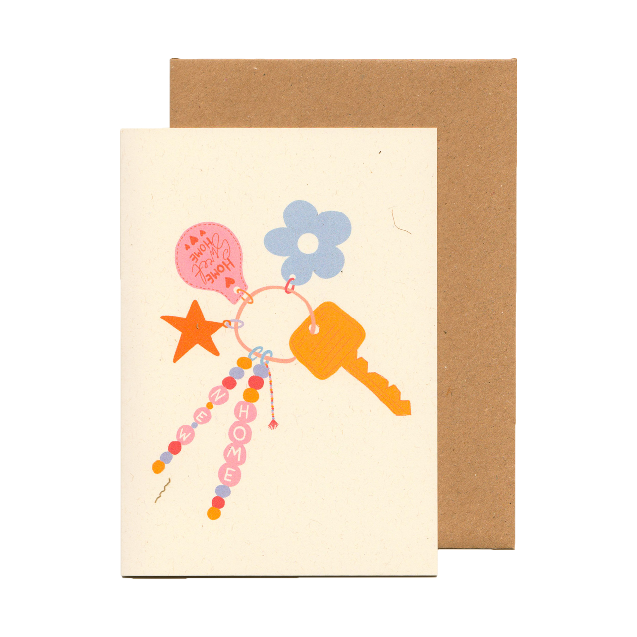 Bring a splash of retro fun. This bold, ’90s-inspired keys and “Home Sweet Home” keyring design is perfect for celebrating a new home with playful, nostalgic energy. Blank inside for your own cheerful message. Printed on FSC® certified card with 80% recycled fibres and 20% ECF virgin fibres, and paired with a 100% recycled kraft…