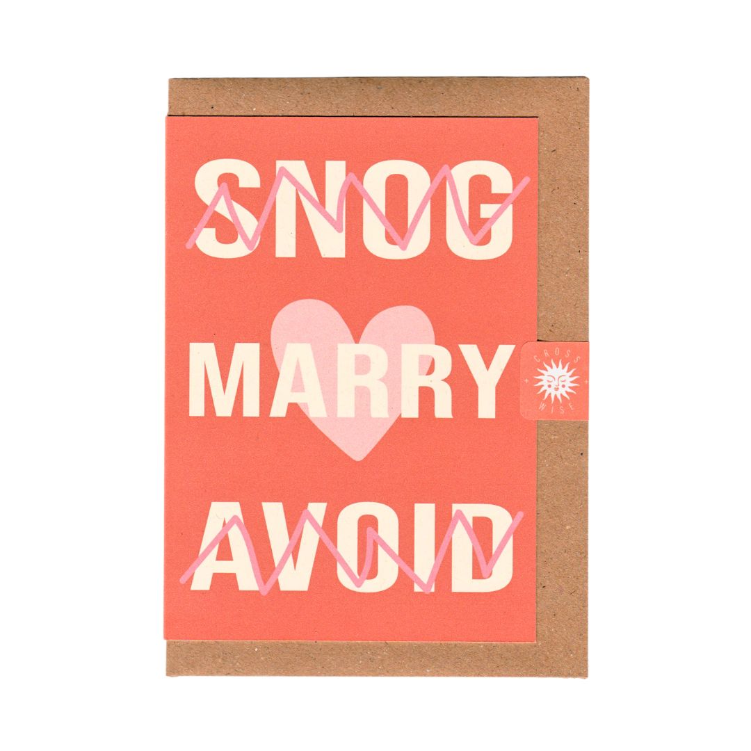 A fun engagement card with “Snog Marry Avoid,” where only “marry” survives. Perfect for cheeky congratulations.